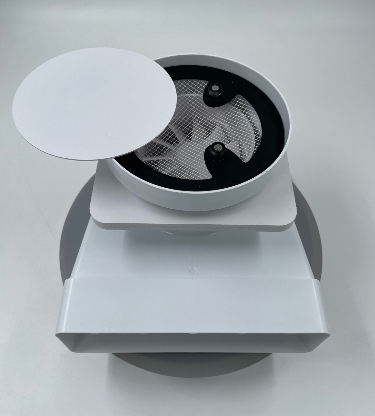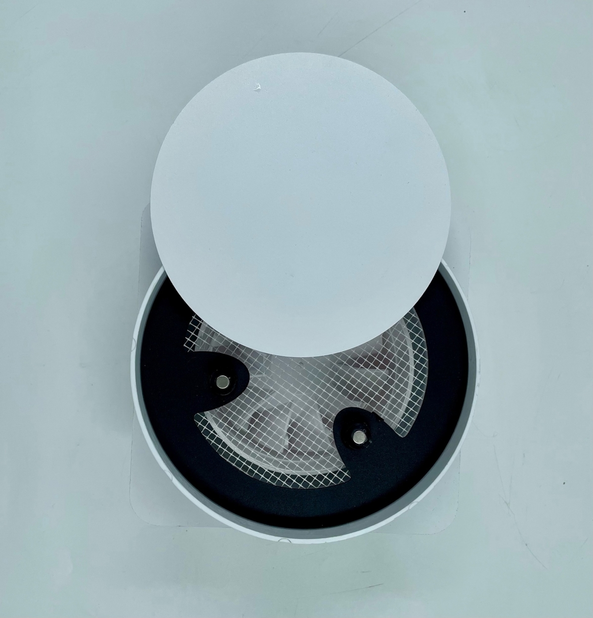 • Решетки сделаны из высококачественного пластика и стали и покрашены в белый матовый цвет муар, который идеально сочетается с цветом и текстурой полотна потолка. Центральный диск держится на неодимовых магнитах.